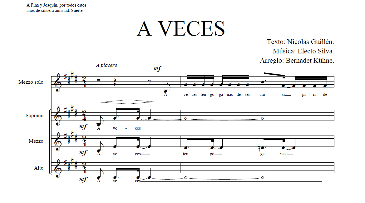A veces (SMA) Anterior Siguiente Favorito Categorías de Archivo: Partituras Voces IgualesEtiquetas de Archivo: SMA DescripciónArchivoTexto: Nicolás Guillén Música: Electo Silva Bernadet Kühne (2001) Para SMA y Solo de Mezzo -----------------EmailWhatsAppFacebook 268 A_veces_SMA.pdf