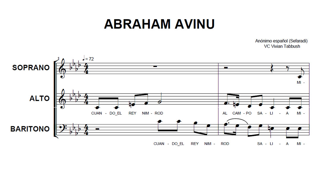 Abraham Avinu Anterior Siguiente Favorito Categorías de Archivo: Partituras SABEtiquetas de Archivo: SAB DescripciónArchivoRetribuir al ArregladorAnónimo español (Sefaradí) Arreglo Coral: Vivian Tabbush -----------------EmailWhatsAppFacebook 213 Abraham-avinu.pdf"¿Te gusta y te es útil este arreglo? Cualquier aporte que puedas hacer en reconocimiento a la labor del Mtro. Vivian Tabbush irá destinado a su Familia. Muchas Gracias!"
