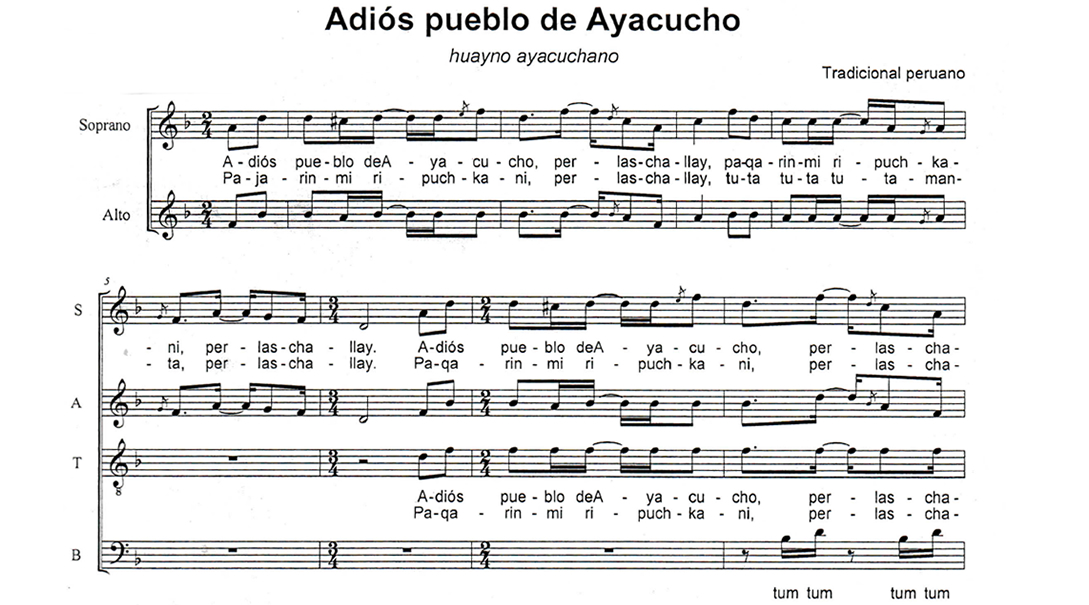 Adiós pueblo de Ayacucho Anterior Siguiente Favorito Categorías de Archivo: Partituras SATBEtiquetas de Archivo: SATB DescripciónArchivoVideo ReferenciaHuayno ayacuchano Tradicional peruano Arreglo Coral: ? -----------------EmailWhatsAppFacebook 488 Adios_Pueblo_de_Ayacucho_SATB.pdfVideo Referencia