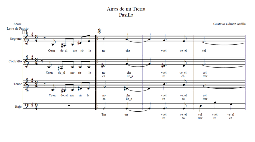 Aires de mi Tierra Anterior Siguiente Favorito Categorías de Archivo: Partituras SATBEtiquetas de Archivo: SATB DescripciónArchivoVideo ReferenciaPasillo Canción Música: Gustavo Gómez Ardila (1913-2006) Letra: Luis Javier Piedrahita (Fausto) -----------------EmailWhatsAppFacebook 168 Aires_de_mi_tierra.pdfVideo Referencia