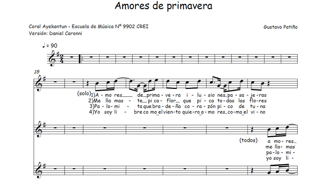 Amores de primavera Anterior Siguiente Favorito Categorías de Archivo: Partituras Voces IgualesEtiquetas de Archivo: SMA DescripciónArchivoLetra y Música: Gustavo Patiño Arreglo Coral: Daniel Caronni SMA + Acompañamiento de Bajo intrumental, sikus y pincuyos -----------------EmailWhatsAppFacebook 100 Amores_de_-primavera_SMA.pdf