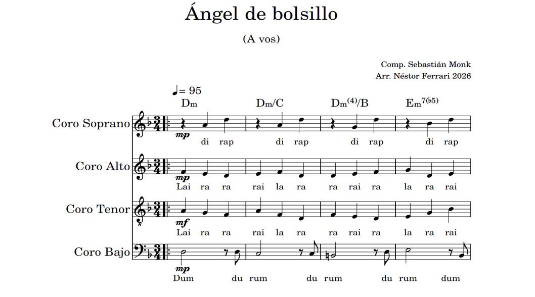 Ángel de bolsillo Anterior Siguiente Favorito Categorías de Archivo: Partituras SATBEtiquetas de Archivo: SATB DescripciónArchivoLetra y Música: Sebastián Monk Arreglo Coral: Néstor Ferrari (2026) -----------------EmailWhatsAppFacebook 48 Angel_de_bolsillo_SATB.pdf
