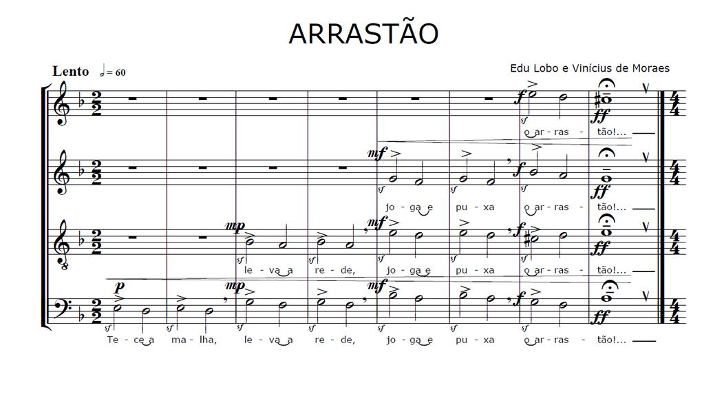 Arrastão Anterior Siguiente Favorito Categorías de Archivo: Partituras SATBEtiquetas de Archivo: SATB DescripciónArchivoMidiLetra: Vinicius de Moraes Música: Edu Lobo Arreglo Coral: ? -----------------EmailWhatsAppFacebook 55 Arrastao_SATB.pdf Arrastao_SATB.mid