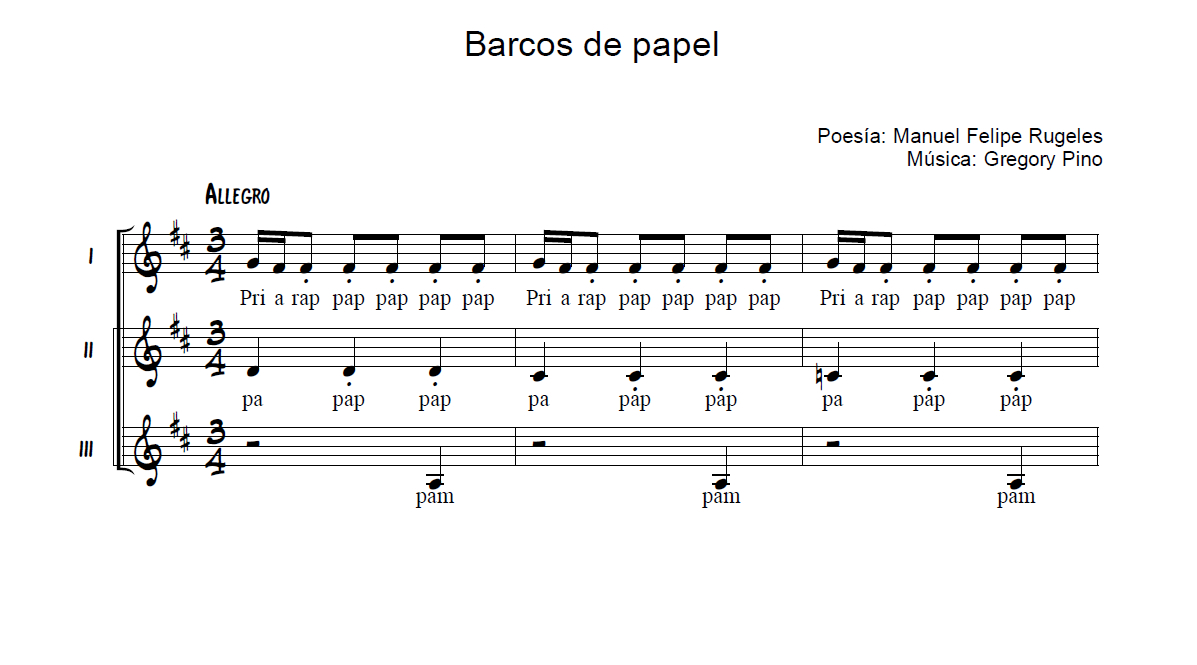 Barcos de papel Anterior Siguiente Favorito Categorías de Archivo: Partituras Voces IgualesEtiquetas de Archivo: SMA DescripciónArchivoVideo ReferenciaRetribuir al ArregladorPoesía: Manuel Felipe Rugeles Música: Gregory Pino Para SMA -----------------EmailWhatsAppFacebook 319 Barcos_de_papel_SMA.pdfVideo Referencia"¿Te gusta y te es útil mi arreglo? Cualquier aporte que puedas hacer seguirá alentando mi labor como arreglador. Muchas Gracias!"