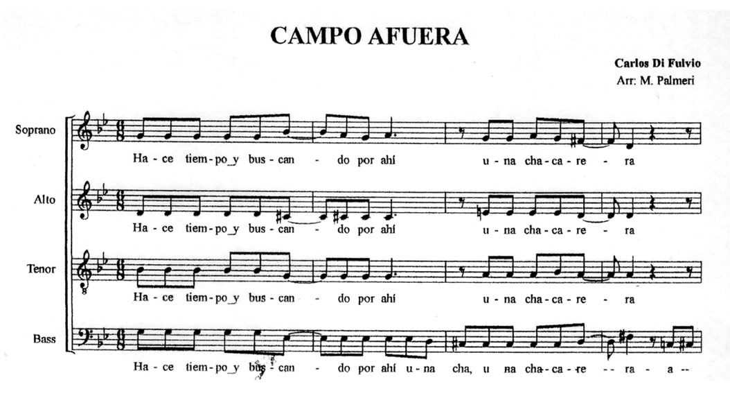 Campo Afuera Anterior Siguiente Favorito Categorías de Archivo: Partituras SATBEtiquetas de Archivo: SATB DescripciónArchivoChacarera Letra y Música: Carlos Di Fulvio Arreglo Coral: Martín Palmieri -----------------EmailWhatsAppFacebook 93 Campo_Afuera.pdf