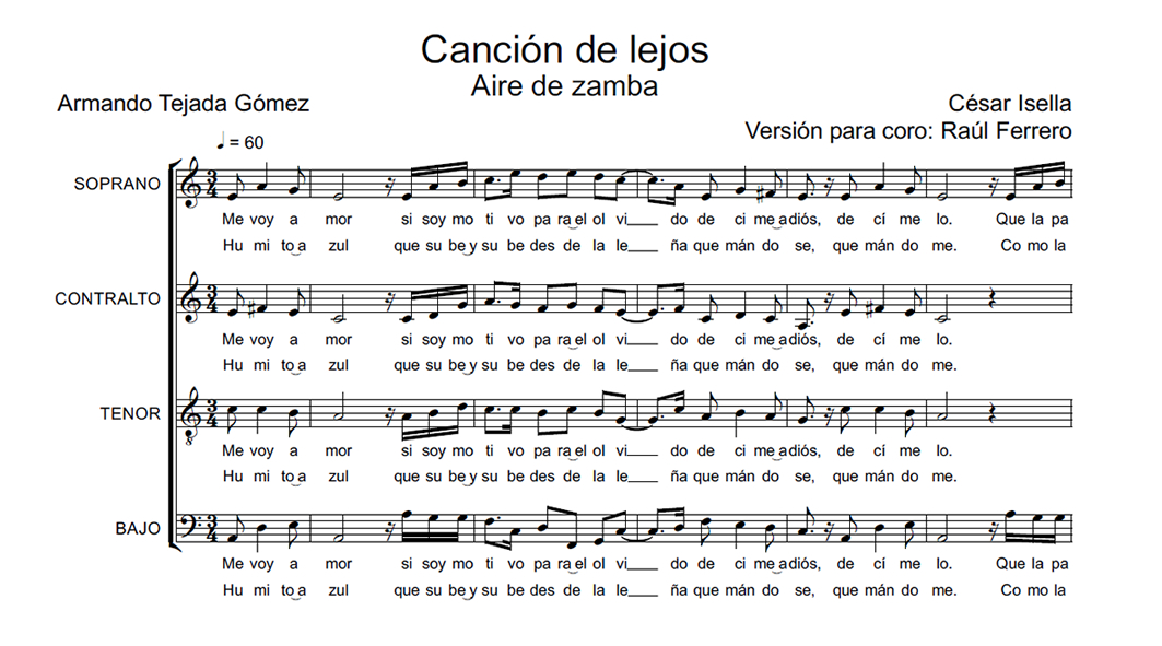 Canción de lejos Anterior Siguiente Favorito Categorías de Archivo: Partituras SATBEtiquetas de Archivo: SATB DescripciónArchivoRetribuir al ArregladorAire de zamba Letra: Armando Tejada Gómez Música: César Isella Arreglo Coral: Raúl Ferrero -----------------EmailWhatsAppFacebook 114 Cancion_de_lejos_SATB.pdf"¿Te gusta y te es útil mi arreglo? Cualquier aporte que puedas hacer seguirá alentando mi labor como arreglador. Muchas Gracias!"
