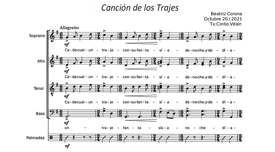 Canción de los trajes Anterior Siguiente Favorito Categorías de Archivo: Partituras SATBEtiquetas de Archivo: SATB DescripciónArchivoMidiVideo ReferenciaLetra y Música: Beatriz Corona (La Habana, 1962) -----------------EmailWhatsAppFacebook 67 Cancion_de_los_trajes_SATB.pdf Cancion_de_los_trajes_SATB.midVideo Referencia