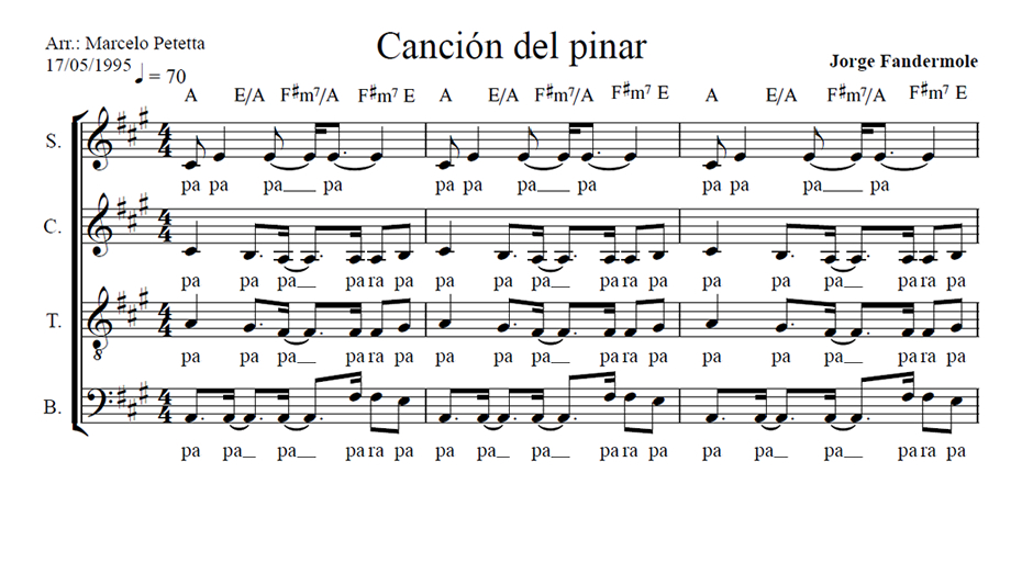 Canción del pinar Anterior Siguiente Favorito Categorías de Archivo: Partituras SATBEtiquetas de Archivo: SATB DescripciónArchivoRetribuir al ArregladorLetra y Música: Jorge Fandermole Arreglo Coral: Marcelo Petetta (17/05/1995) -----------------EmailWhatsAppFacebook 150 Cancion_del_pinar_Marcelo_Petetta.pdf"¿Te gusta y te es útil mi arreglo? Cualquier aporte que puedas hacer seguirá alentando mi labor como arreglador. Muchas Gracias!"