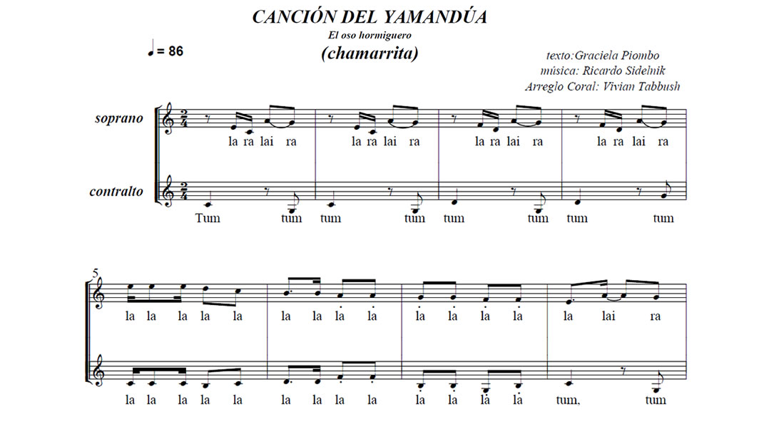 Canción del Yamandúa Anterior Siguiente Favorito Categorías de Archivo: Partituras Voces IgualesEtiquetas de Archivo: SA DescripciónArchivoRetribuir al ArregladorEl oso hormiguero (Chamarrita) Texto:Graciela Piombo Música: Ricardo Sidelnik Arreglo Coral: Vivian Tabbush Para SA -----------------EmailWhatsAppFacebook 178 CanciondelYamandua.pdf"¿Te gusta y te es útil este arreglo? Cualquier aporte que puedas hacer en reconocimiento a la labor del Mtro. Vivian Tabbush irá destinado a su Familia. Muchas Gracias!"