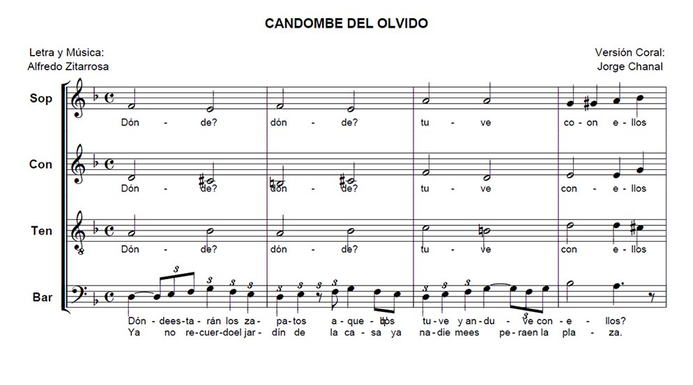 Candombe del Olvido Anterior Siguiente Favorito Categorías de Archivo: Partituras SATBEtiquetas de Archivo: SATB DescripciónArchivoMidiRetribuir al ArregladorLetra y Música: Alfredo Zitarrosa Arreglo Coral: Jorge B. Chanal -----------------EmailWhatsAppFacebook 266 Candombe_del_olvido.pdf Candombe_del_olvido.mid"¿Te gusta y te es útil este arreglo? Cualquier aporte que puedas hacer en reconocimiento a la labor del Mtro. Jorge Chanal irá destinado a su Familia. Muchas Gracias!"