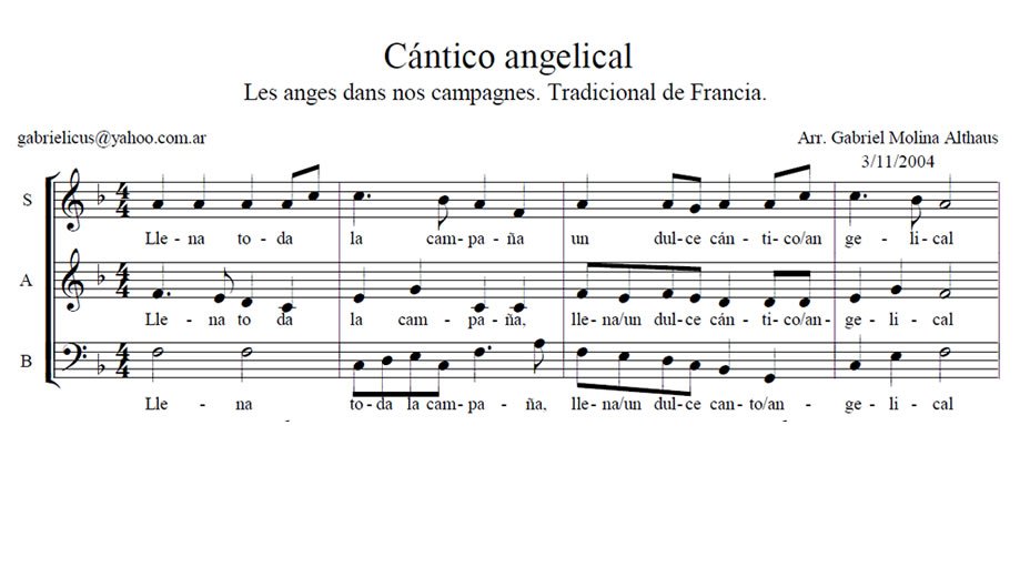 Cántico angelical Anterior Siguiente Favorito Categorías de Archivo: Partituras SABEtiquetas de Archivo: Navidad SAB DescripciónArchivoRetribuir al ArregladorLes anges dans nos campagnes Tradicional de Francia. Arreglo Coral: Gabriel Molina Althaus (3/11/2004) -----------------EmailWhatsAppFacebook 384 Cantico_angelical.pdf"¿Te gusta y te es útil mi arreglo? Cualquier aporte que puedas hacer seguirá alentando mi labor como arreglador. Muchas Gracias!"