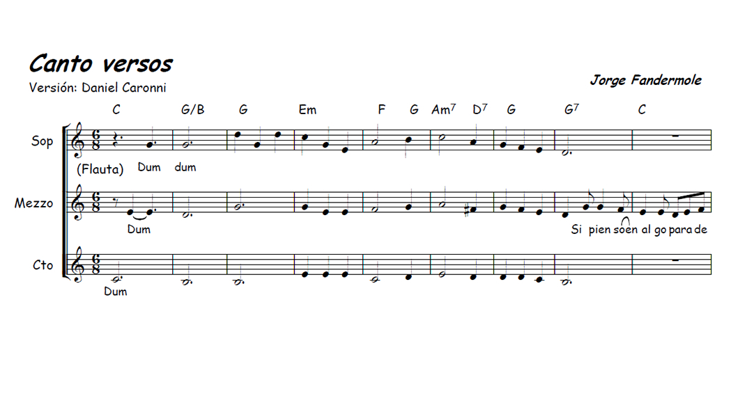 Canto versos (SMA) Anterior Siguiente Favorito Categorías de Archivo: Partituras Voces IgualesEtiquetas de Archivo: SMA DescripciónArchivoLetra y Música: Jorge Fandermole Arreglo Coral: Daniel Caronni SMA + Flauta -----------------EmailWhatsAppFacebook 141 Canto_versos_SMA.pdf