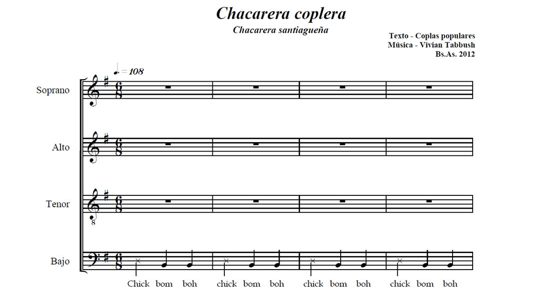 Chacarera Coplera Anterior Siguiente Favorito Categorías de Archivo: Partituras SATBEtiquetas de Archivo: SATB DescripciónArchivoRetribuir al ArregladorChacarera santiagueña Texto: Coplas populares Música: Vivian Tabbush (Bs.As. 2012) -----------------EmailWhatsAppFacebook 171 Chacarera-Coplera.pdf"¿Te gusta y te es útil este arreglo? Cualquier aporte que puedas hacer en reconocimiento a la labor del Mtro. Vivian Tabbush irá destinado a su Familia. Muchas Gracias!"