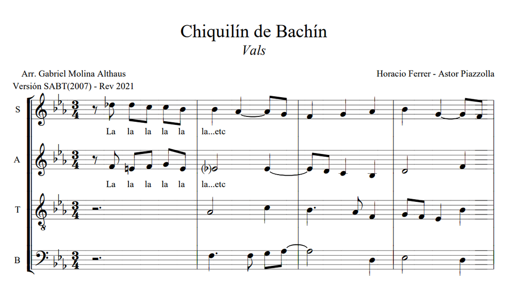 Chiquilín de Bachín Anterior Siguiente Favorito Categorías de Archivo: Partituras SATBEtiquetas de Archivo: SATB DescripciónArchivoVideo ReferenciaRetribuir al ArregladorCanción porteña de Ástor Piazzolla y Horacio Ferrer Arreglo Coral: Gabriel Molina Althaus -----------------EmailWhatsAppFacebook 499 Chiquilin-de-Bachin-SATB-rev2021.pdfVideo Referencia"¿Te gusta y te es útil mi arreglo? Cualquier aporte que puedas hacer seguirá alentando mi labor como arreglador. Muchas Gracias!"