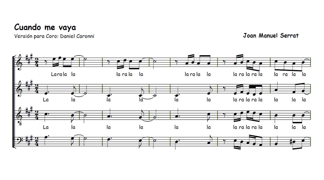 Cuando me vaya Anterior Siguiente Favorito Categorías de Archivo: Partituras SATBEtiquetas de Archivo: SATB DescripciónArchivoLetra y Música: Joan Manuel Serrat Arreglo Coral: Daniel Caronni -----------------EmailWhatsAppFacebook 143 Cuando_me_vaya_SATB.pdf