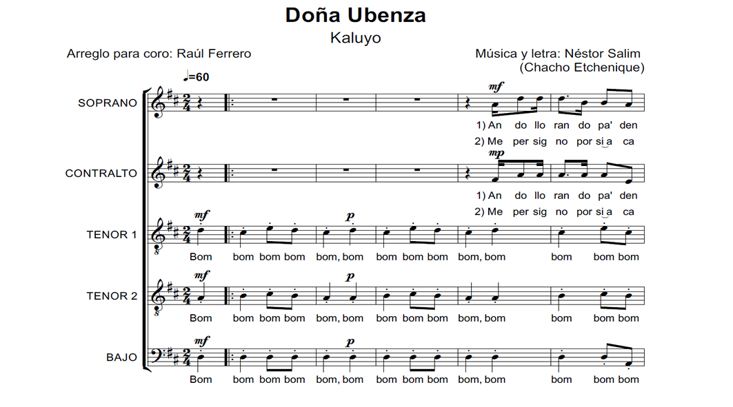 Doña Ubenza Anterior Siguiente Favorito Categorías de Archivo: Partituras SATB+Etiquetas de Archivo: SATTB DescripciónArchivoRetribuir al ArregladorKaluyo* Letra y Música: Néstor Salim (Chacho Etchenique) Arreglo Coral: Raúl Ferrero *(Inspirado en una mujer de San Antonio de los Cobres) Para SATTB -----------------EmailWhatsAppFacebook 76 Dona_Ubenza_SATB.pdf"¿Te gusta y te es útil mi arreglo? Cualquier aporte que puedas hacer seguirá alentando mi labor como arreglador. Muchas Gracias!"