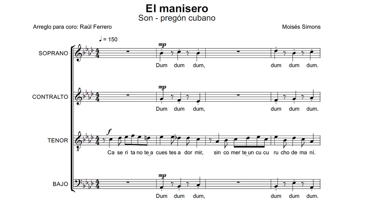 El Manisero Anterior Siguiente Favorito Categorías de Archivo: Partituras SATBEtiquetas de Archivo: SATB DescripciónArchivoRetribuir al ArregladorSon Pregón Cubano Letra y música: Moisés Simons Arreglo Coral: Raúl Ferrero -----------------EmailWhatsAppFacebook 1.157 el_manisero.pdf"¿Te gusta y te es útil mi arreglo? Cualquier aporte que puedas hacer seguirá alentando mi labor como arreglador. Muchas Gracias!"