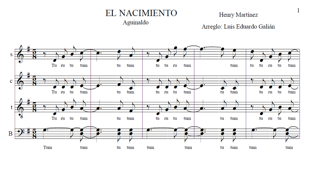 El Nacimiento (Aguinaldo Venezolano) Anterior Siguiente Favorito Categorías de Archivo: Partituras SATBEtiquetas de Archivo: Navidad SATB DescripciónArchivoMidiRetribuir al ArregladorAguinaldo Venezolano Letra y Música: Henry Martínez Arreglo Coral: Luis Eduardo Galián (Venezolano) para SATB con divisi en los bajos. -----------------EmailWhatsAppFacebook 447 El-Nacimiento.pdf El-Nacimiento.mid"¿Te gusta y te es útil mi arreglo? Cualquier aporte que puedas hacer seguirá alentando mi labor como arreglador. Muchas Gracias!"