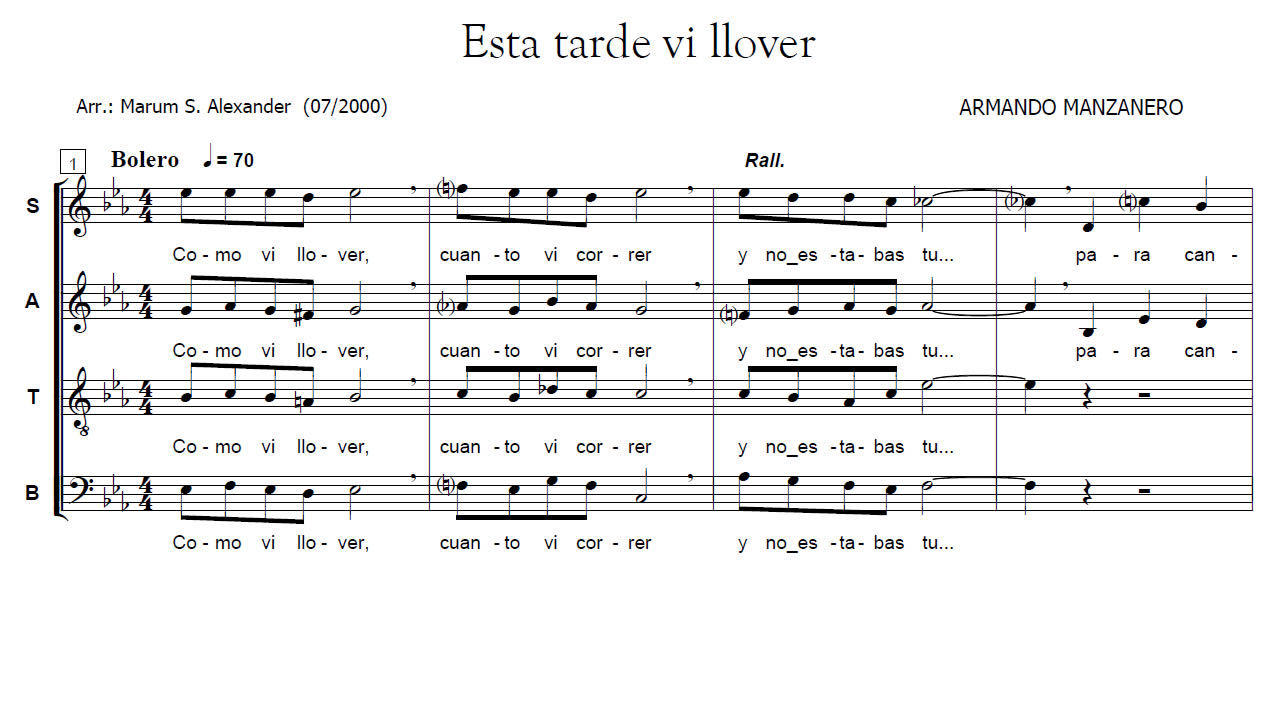 Esta tarde vi llover Anterior Siguiente Favorito Categorías de Archivo: Partituras SATBEtiquetas de Archivo: SATB DescripciónArchivoMidiLetra y Musica: Armando Manzanero Arreglo Coral: Marum S. Alexander (07/2000) -----------------EmailWhatsAppFacebook 278 Esta_tarde_vi_llover.pdf Esta_tarde_vi_llover.mid