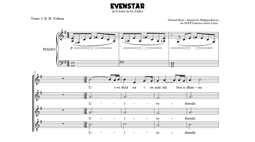 Evenstar Anterior Siguiente Favorito Categorías de Archivo: Partituras SATBEtiquetas de Archivo: SATB DescripciónArchivoVideo Referenciade «El Señor de los Anillos» Texto: J.R.R.Tolkien Música: Howard Shore Adap.: Phillippa Boyens Arreglo Coral: Francisco Javier López Con solo de Soprano y acompañamiento de piano. -----------------EmailWhatsAppFacebook 194 Evenstar.pdfVideo Referencia