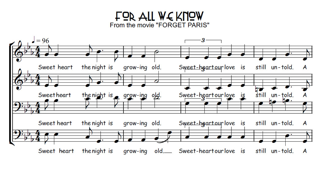 For All We Know Anterior Siguiente Favorito Categorías de Archivo: Partituras SATBEtiquetas de Archivo: SATB DescripciónArchivode la película de 1995 «Forget Paris» Letra: Sam M. Lewis Música: J. Fred Coots Arreglo Coral: The lone arranger -----------------EmailWhatsAppFacebook 33 For_All_We_Know_SATB.pdf