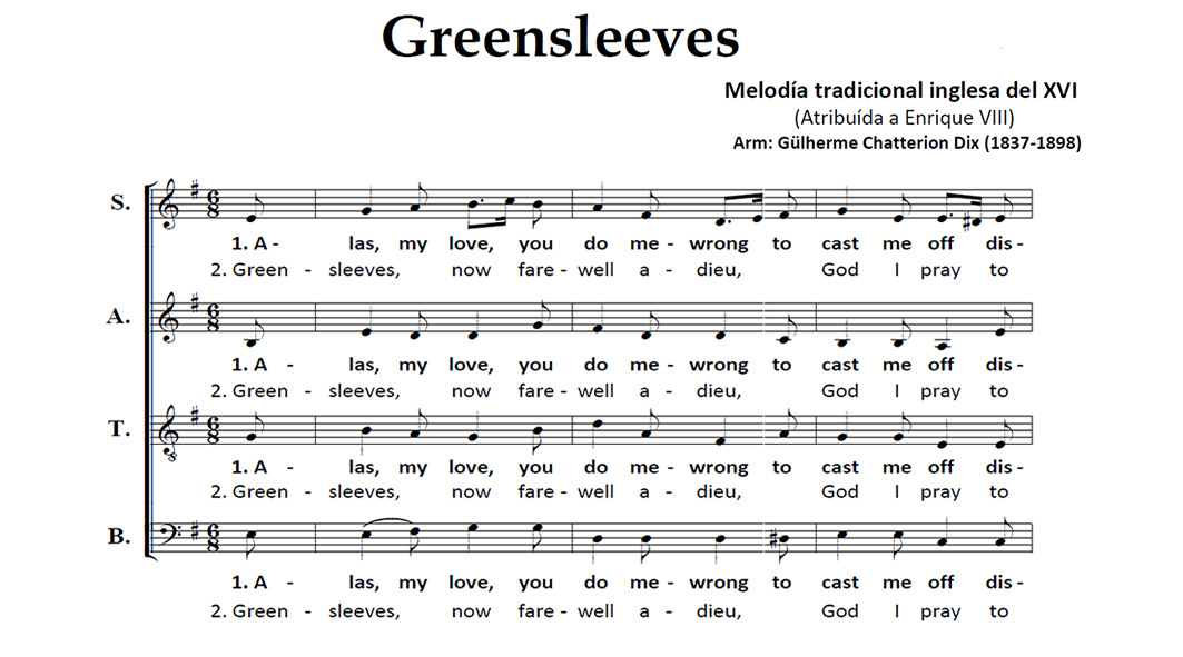Greensleeves Anterior Siguiente Favorito Categorías de Archivo: Partituras SATBEtiquetas de Archivo: Navidad SATB DescripciónArchivoMidiMelodía tradicional inglesa del XVI (Atribuida a Enrique VIII) Armonización: Gülherme Chatterion Dix (1837-1898) -----------------EmailWhatsAppFacebook 140 Greensleeves_SATB.pdf Greensleeves.mid