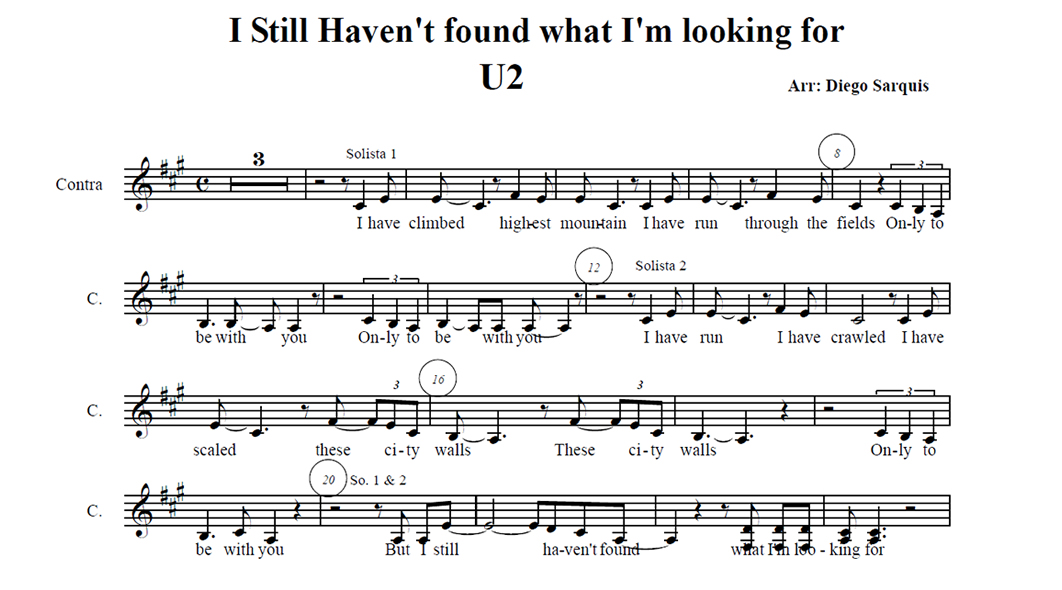 I Still Haven't found what I'm looking for Anterior Siguiente Favorito Categorías de Archivo: Partituras SATBEtiquetas de Archivo: SATB DescripciónArchivoRetribuir al ArregladorLetra y Música: U2 Arreglo Coral: Diego E. Sarquis SATB con Alto solista. -----------------EmailWhatsAppFacebook 172 I_still_haven_found.pdf"¿Te gusta y te es útil mi arreglo? Cualquier aporte que puedas hacer seguirá alentando mi labor como arreglador. Muchas Gracias!"