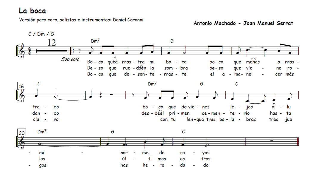 La boca Anterior Siguiente Favorito Categorías de Archivo: Partituras SATBEtiquetas de Archivo: SATB DescripciónArchivoLetra y Música: Joan Manuel Serrat Arreglo Coral: Daniel Caronni SATB + parte para Flautas -----------------EmailWhatsAppFacebook 107 La_boca_SATB.pdf