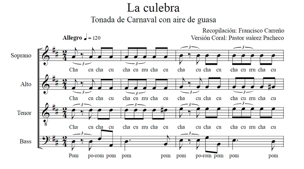 La Culebra Anterior Siguiente Favorito Categorías de Archivo: Partituras SATBEtiquetas de Archivo: SATB DescripciónArchivoMidiVideo ReferenciaTonada de Carnaval con aire de guasa Recopilación: Francisco Carreño Arreglo Coral: Pastor Suárez Pacheco -----------------EmailWhatsAppFacebook 289 La-culebra.pdf La-Culebra.midVideo Referencia