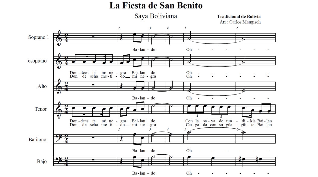 La Fiesta de San Benito Anterior Siguiente Favorito Categorías de Archivo: Partituras SATB+Etiquetas de Archivo: SSATBB DescripciónArchivoRetribuir al ArregladorSaya Boliviana Arreglo Coral: Carlos Mangisch (1954-2005) Para SSATBB -----------------EmailWhatsAppFacebook 99 La_Fiesta_de_San_Benito_SSATBB.pdf"¿Te gusta y te es útil este arreglo? Cualquier aporte que puedas hacer en reconocimiento a la labor del Mtro. Carlos Mangisch irá destinado a su Familia. Muchas Gracias!"