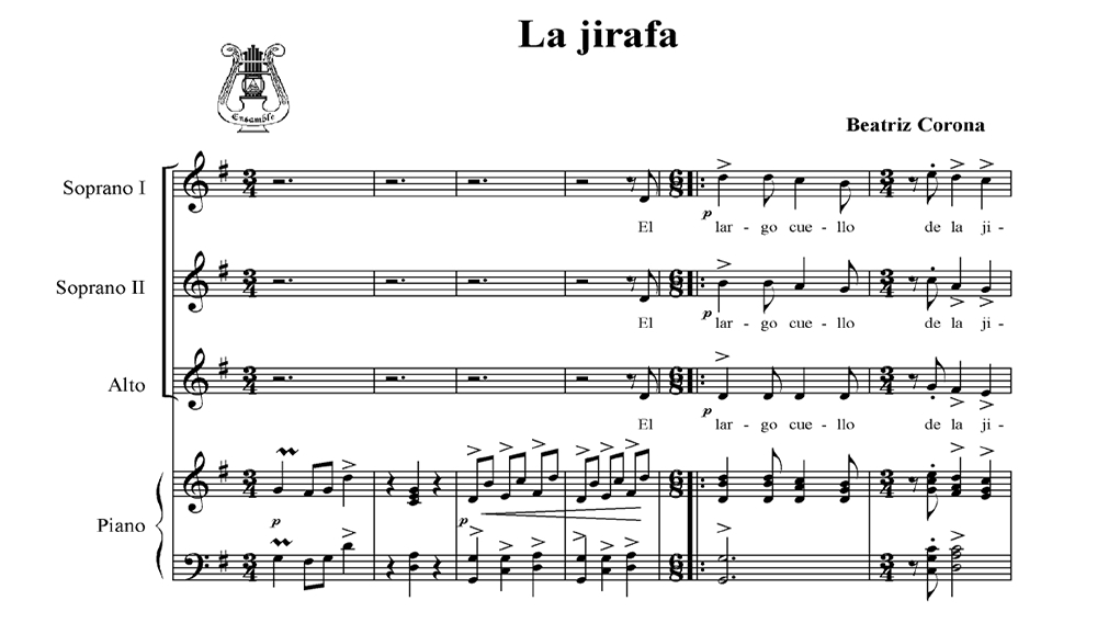 La Jirafa Anterior Siguiente Favorito Categorías de Archivo: Partituras Voces IgualesEtiquetas de Archivo: SSA DescripciónArchivoVideo Referencia(Al largo cuello de la jirafa) N° 1 de Cuatro canciones infantiles Adolfo Martí (Cuba, 1922-2002) Música: Beatriz Corona Para SSA y Piano. -----------------EmailWhatsAppFacebook 163 La_Jirafa_SSA.pdfVideo Referencia