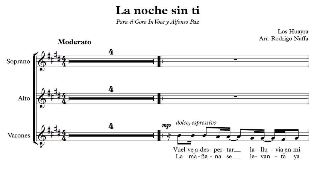 La noche sin ti Anterior Siguiente Favorito Categorías de Archivo: Partituras Otros RegistrosEtiquetas de Archivo: SAT DescripciónArchivoRetribuir al ArregladorLetra y Música: (Los Huayra) Letra: Hernando Mónico Música: Juan José Vasconcellos Arreglo Coral: Rodrigo Naffa Para SAT -----------------EmailWhatsAppFacebook 145 La_noche_sin_ti_SAT.pdf"¿Te gusta y te es útil mi arreglo? Cualquier aporte que puedas hacer seguirá alentando mi labor como arreglador. Muchas Gracias!"