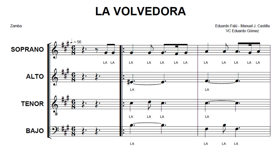 La Volvedora Anterior Siguiente Favorito Categorías de Archivo: Partituras SATBEtiquetas de Archivo: SATB DescripciónArchivoMidiZamba Letra: Manuel J. Castilla Música: Eduardo Falú Arreglo Coral: Eduardo Gómez -----------------EmailWhatsAppFacebook 75 La_volvedora_SATB.pdf La_volvedora_SATB.mid