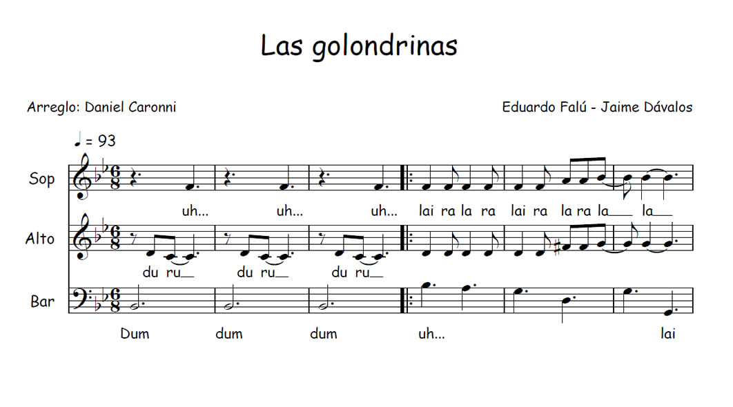 Las golondrinas Anterior Siguiente Favorito Categorías de Archivo: Partituras SABEtiquetas de Archivo: SAB DescripciónArchivoLetra y Música: Eduardo Falú y Jaime Dávalos Arreglo Coral: Daniel Caronni -----------------EmailWhatsAppFacebook 359 Las_golondrinas_SAB.pdf