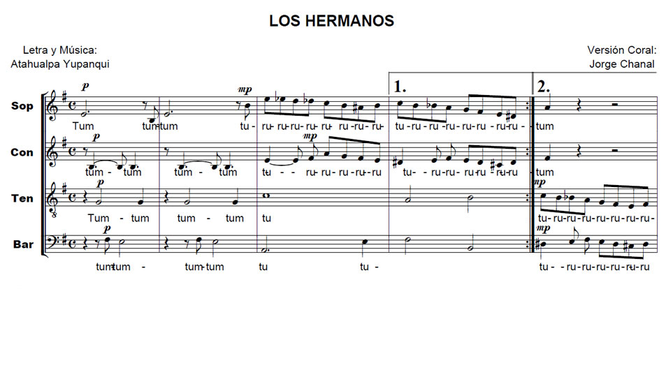 Los Hermanos Anterior Siguiente Favorito Categorías de Archivo: Partituras SATBEtiquetas de Archivo: SATB DescripciónArchivoMidiRetribuir al ArregladorLetray Música: Atahualpa Yupanqui Arreglo Coral: Juorge Chanal -----------------EmailWhatsAppFacebook 114 lor-hermanos.pdf los-hermanos.mid"¿Te gusta y te es útil este arreglo? Cualquier aporte que puedas hacer en reconocimiento a la labor del Mtro. Jorge Chanal irá destinado a su Familia. Muchas Gracias!"