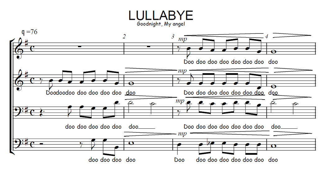 Lullabye (Goodnight, My Angel) Anterior Siguiente Favorito Categorías de Archivo: Partituras SATBEtiquetas de Archivo: SATB DescripciónArchivoMidiLetra y Música: Billy Joel Arreglo Coral: The lone arranger -----------------EmailWhatsAppFacebook 66 Lullabye_SATB.pdf Lullabye_SATB.mid