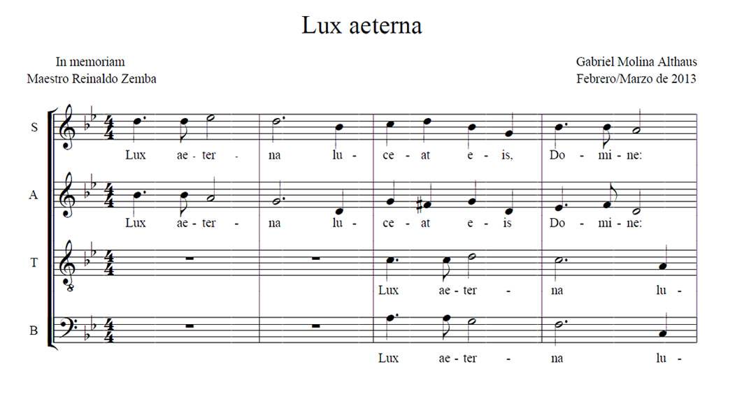 Lux aeterna (Gabriel Molina Althaus) Anterior Siguiente Favorito Categorías de Archivo: Partituras SATBEtiquetas de Archivo: SATB DescripciónArchivoAudio de EstudioRetribuir al ArregladorCompositor: Gabriel Molina Althaus (Febrero/Marzo de 2013) In memoriam Maestro Reinaldo Zemba -----------------EmailWhatsAppFacebook 113 Lux_aeterna_SATB.pdfAudio de Estudio"¿Te gusta y te es útil mi arreglo? Cualquier aporte que puedas hacer seguirá alentando mi labor como arreglador. Muchas Gracias!"