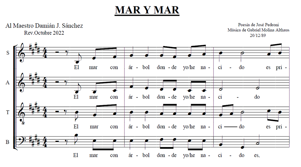 «Mar y mar» fue escrita para integrar la «Cantata a Don José Esperanza», estrenada en 1989 con motivo del 90° aniversario del natalicio de José Pedroni. La partitura fue aceptada por la Choral Public Domain Library y desde allí se difundió globalmente. Fue grabada por varios coros, tanto en Europa como en nuestro continente. Está dedicada al Maestro Damián Sánchez, amigo personal y gran admirador de la obra de Pedroni y autor de las más bellas musicalizaciones de varios de sus poemas («Cuando estoy triste» «Mamá angustia», «Lllegan por la siembra» «La cuna de tu hijo», entre otras.)