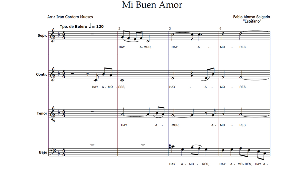 Mi Buen Amor Anterior Siguiente Favorito Categorías de Archivo: Partituras SATBEtiquetas de Archivo: SATB DescripciónArchivoMidiVideo ReferenciaBolero Letra y Música: Fabio Alonso Salgado «Estéfano» Arreglo Coral: Iván Cordero Mueses -----------------EmailWhatsAppFacebook 310 Mi_Buen_Amor.pdf Mi_Buen_Amor.midVideo Referencia