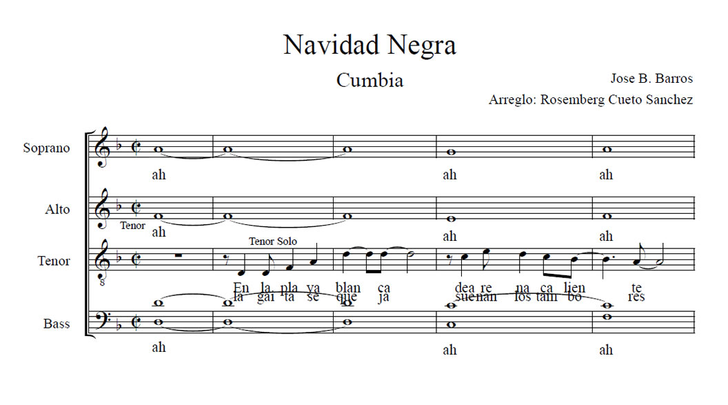 Navidad Negra Anterior Siguiente Favorito Categorías de Archivo: Partituras SATBEtiquetas de Archivo: Navidad SATB DescripciónArchivoCumbia / Villancico Letra y Música: Jose B. Barros Arreglo Coral: Rosemberg Cueto Sanchez -----------------EmailWhatsAppFacebook 32 Navidad_Negra_SATB.pdf
