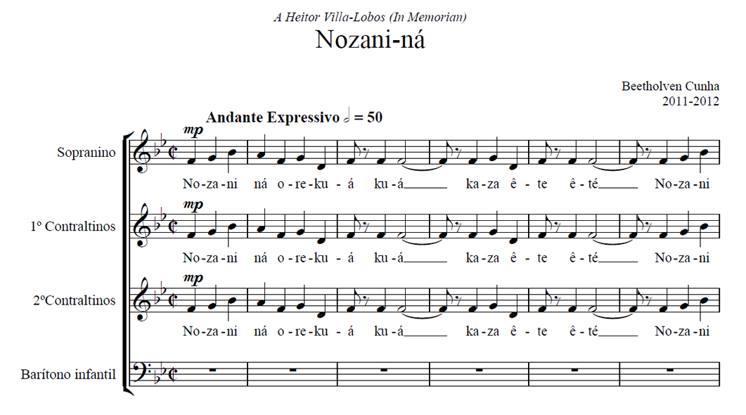Nozani-ná Anterior Siguiente Favorito Categorías de Archivo: Partituras Otros RegistrosEtiquetas de Archivo: SSAB DescripciónArchivoVideo ReferenciaA Heitor Villa-Lobos (In Memorian) Beetholven Cunha (2011-2012) Trabajo desarrollado sobre un tema de los indios Parecí (Serra do Norte – Mato Grosso) Recopilado por Edgar Roquete Pinto en 1900. -----------------EmailWhatsAppFacebook 112 Nozani-na_SATB.pdfVideo Referencia