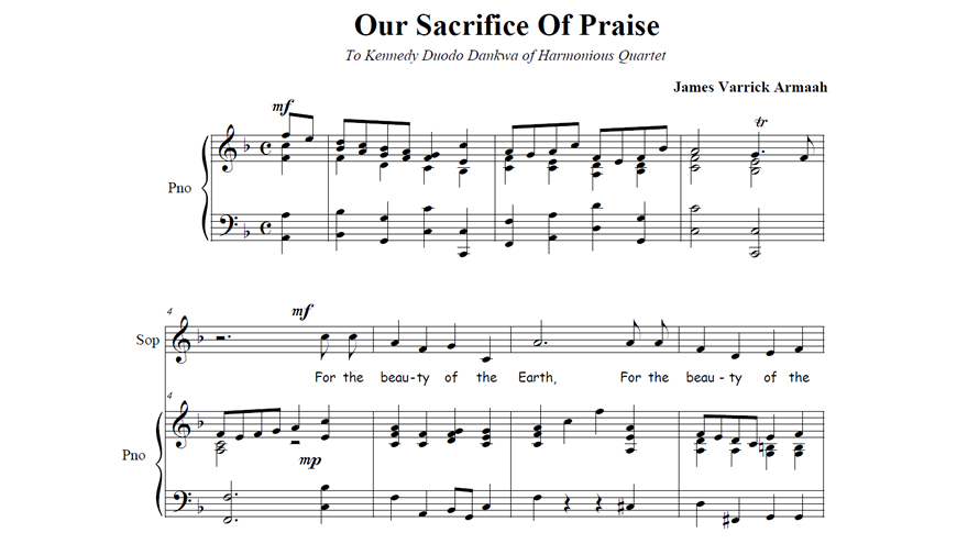 Our Sacrifice Of Praise Anterior Siguiente Favorito Categorías de Archivo: Partituras SATBEtiquetas de Archivo: SATB DescripciónArchivoVideo ReferenciaJames Varrick Armaah Fundador/Director Ejecutivo de Harmonious Chorale Ghana Escritor y compositor de Ghana, África -----------------EmailWhatsAppFacebook 160 Our_Sacrifice_Of_Praise.pdfVideo Referencia