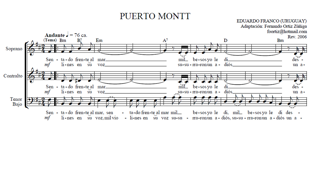 Puerto Montt Anterior Siguiente Favorito Categorías de Archivo: Partituras SABEtiquetas de Archivo: SAB DescripciónArchivoLetra y Música: Eduardo Franco (Uruguay) Adaptación: Fernando Ortiz Zúñiga Rev. 2006 -----------------EmailWhatsAppFacebook 381 Puerto_Montt_SAB.pdf