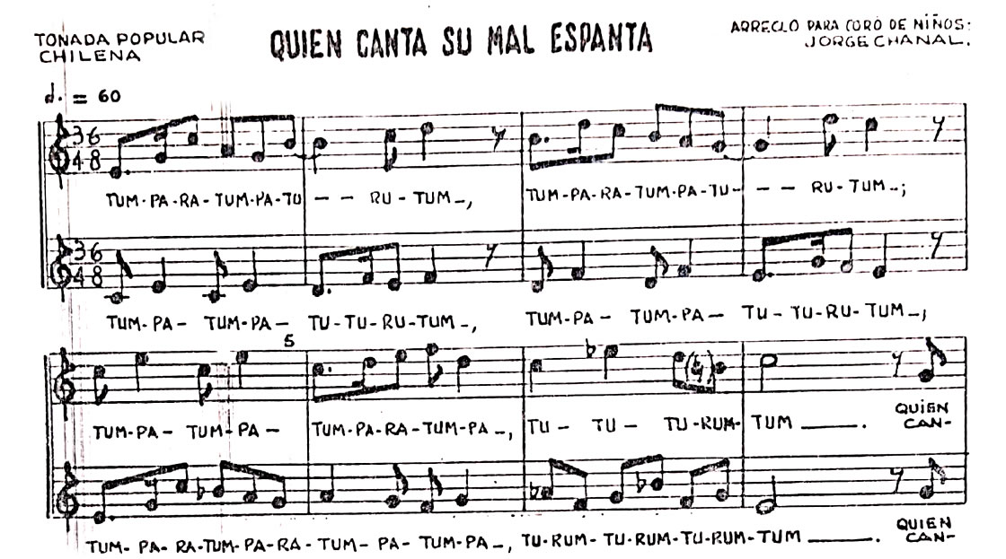 Quien canta su mal espanta Anterior Siguiente Favorito Categorías de Archivo: Partituras Voces IgualesEtiquetas de Archivo: SA DescripciónArchivoRetribuir al ArregladorTonada Popular Chilena Arreglo Coral: Jorge B. Chanal Para SA -----------------EmailWhatsAppFacebook 273 Quien-canta-su-mal-espanta_SA.pdf"¿Te gusta y te es útil este arreglo? Cualquier aporte que puedas hacer en reconocimiento a la labor del Mtro. Jorge Chanal irá destinado a su Familia. Muchas Gracias!"