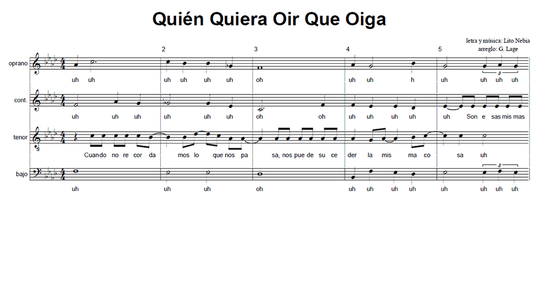 Quien quiera oir que oiga Anterior Siguiente Favorito Categorías de Archivo: Partituras SATBEtiquetas de Archivo: SATB DescripciónArchivoMidiLetra y Música: Litto Nebbia Arreglo Coral: Gabriel Lage -----------------EmailWhatsAppFacebook 130 Quien_quiera_oir_que_oiga.pdf Quien_quiera_oir_que_oiga.mid