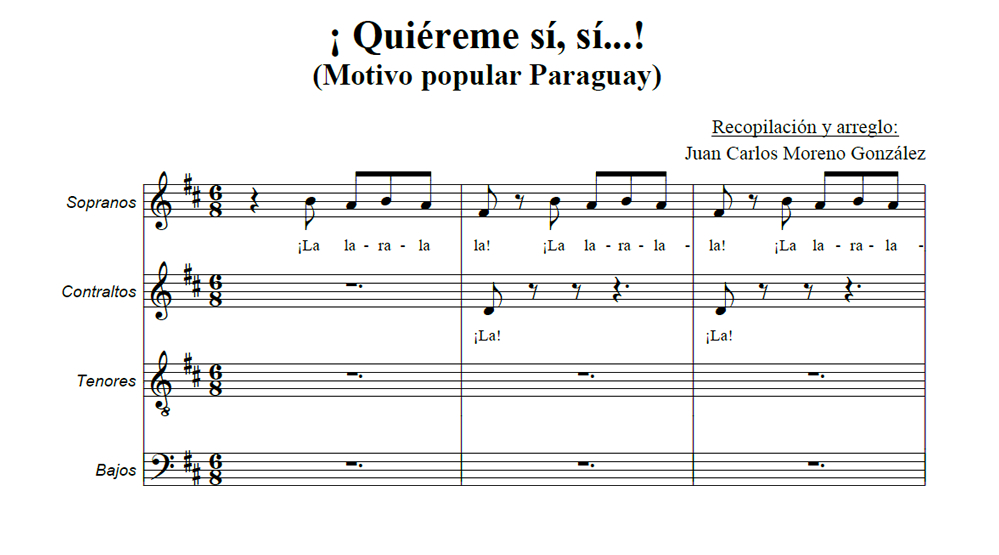 Quiéreme sí, sí! Anterior Siguiente Favorito Categorías de Archivo: Partituras SATBEtiquetas de Archivo: SATB DescripciónArchivoVideo ReferenciaMotivo popular Paraguay Recopilación y arreglo coral: Juan Carlos Moreno González -----------------EmailWhatsAppFacebook 119 Quiereme_si_si.pdfVideo Referencia