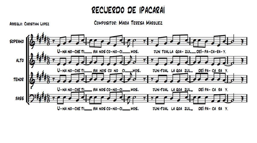 Recuerdos de Ypacaraí Anterior Siguiente Favorito Categorías de Archivo: Partituras SATBEtiquetas de Archivo: SATB DescripciónArchivoVideo ReferenciaRitmo de Guarania (Paraguay) Letra y Música: Demetrio Ortiz Arreglo Coral: Christian López -----------------EmailWhatsAppFacebook 184 recuerdo-de-ipacaray-Full-Score.pdfVideo Referencia