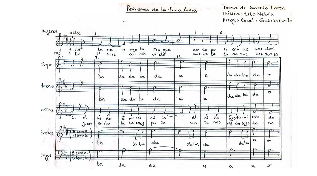 Romance de la Luna Luna Anterior Siguiente Favorito Categorías de Archivo: Partituras SATB+Etiquetas de Archivo: SMATB DescripciónArchivoPoema: Federico García Lorca Música: Lito Nebbia Arreglo Coral: Gabriel Gestal Para SMATB -----------------EmailWhatsAppFacebook 156 Romance_de_la_luna_luna_SMATB.pdf