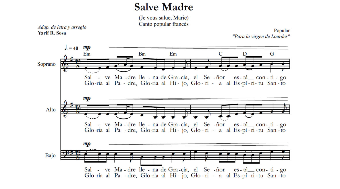 Adaptación de la letra al español y arreglo a 3 voces del canto tradicional francés «Je vous salue Marie».