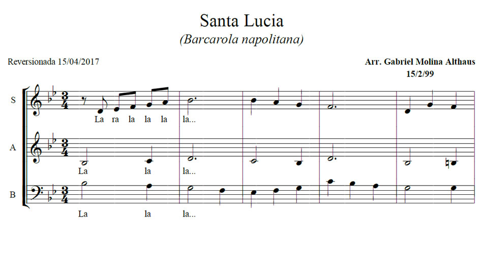Santa Lucia Anterior Siguiente Favorito Categorías de Archivo: Partituras SABEtiquetas de Archivo: SAB DescripciónArchivoAudio de EstudioRetribuir al Arreglador(Barcarola napolitana) Arreglo Coral: Gabriel Molina Althaus (15/2/99) Reversionada 15/04/2017 -----------------EmailWhatsAppFacebook 429 Santa_Lucia_SAB.pdfAudio de Estudio"¿Te gusta y te es útil mi arreglo? Cualquier aporte que puedas hacer seguirá alentando mi labor como arreglador. Muchas Gracias!"